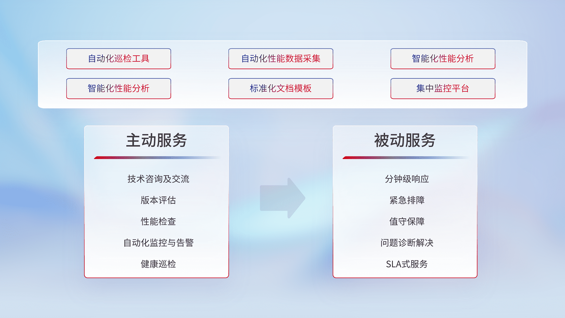 智能化工具和标准化文档,,,保障服务质量,,,,提供主动服务(包含技术咨询、、、版本评估、、、、性能检查、、自动化监控与告警、、健康巡检)和被动服务包含(分钟级响应、、、、紧急排障、、、、值守保障、、、、问题诊断解决、、、SLA服务)。。